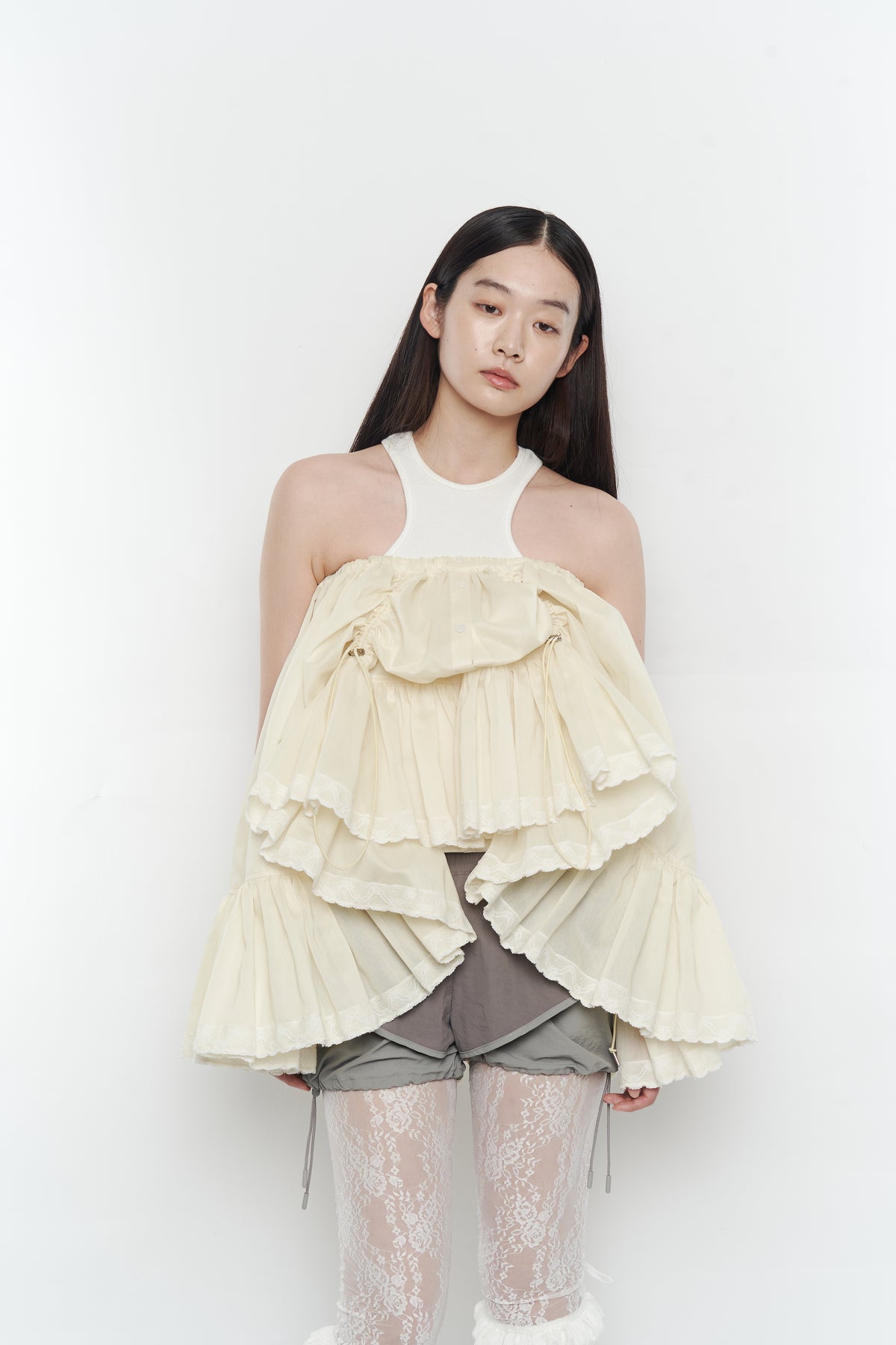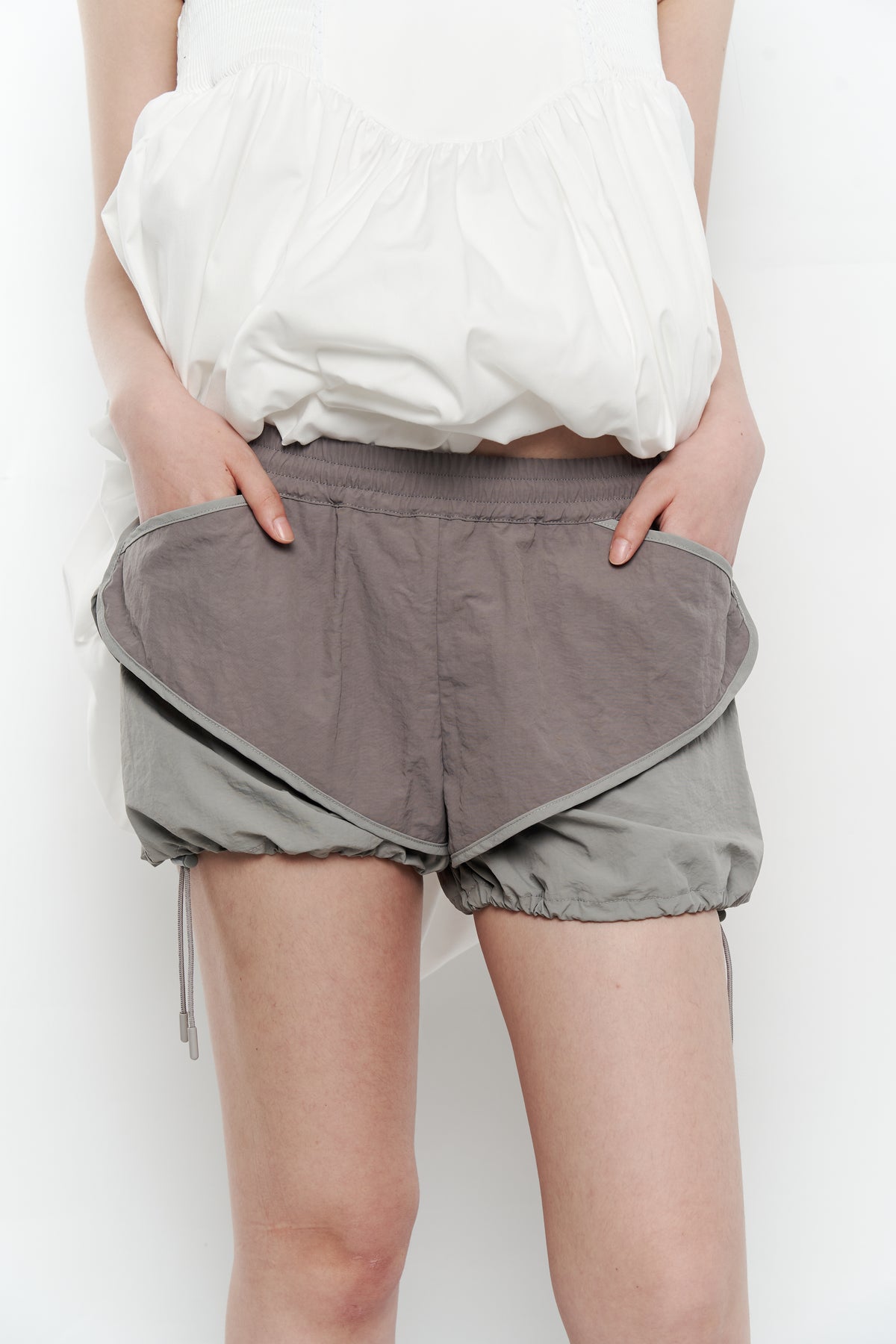・インナー部分のカボチャパンツの裾は、ドローストリングをすぼめず広げたままでも着られます。
