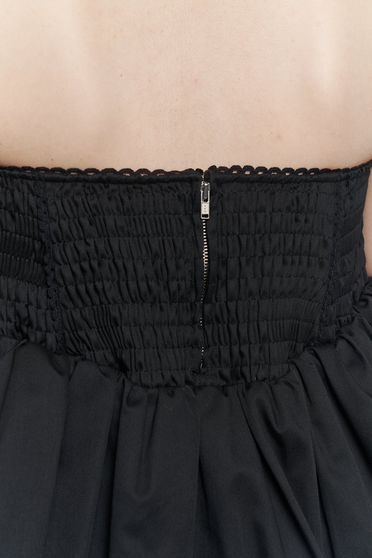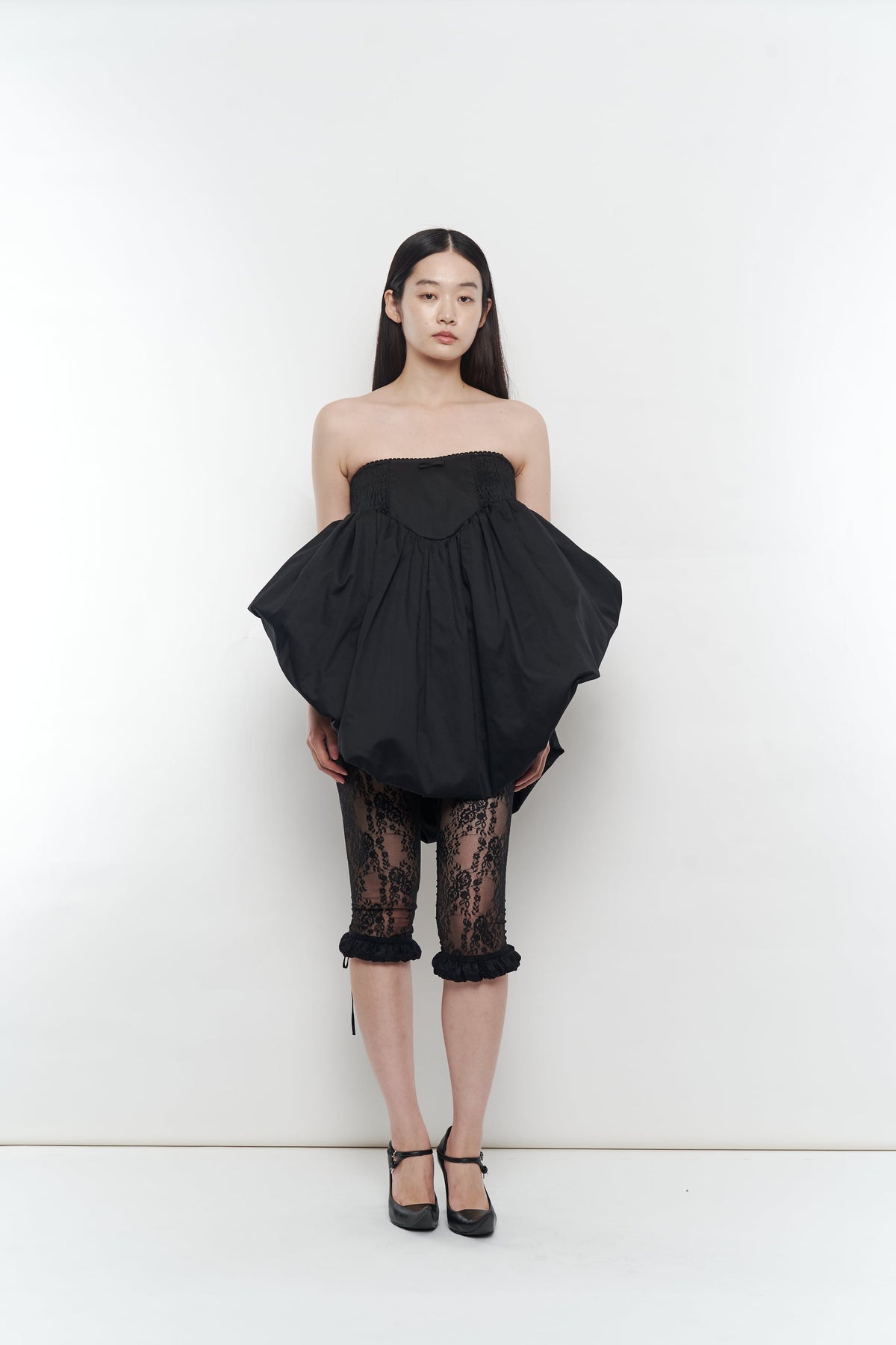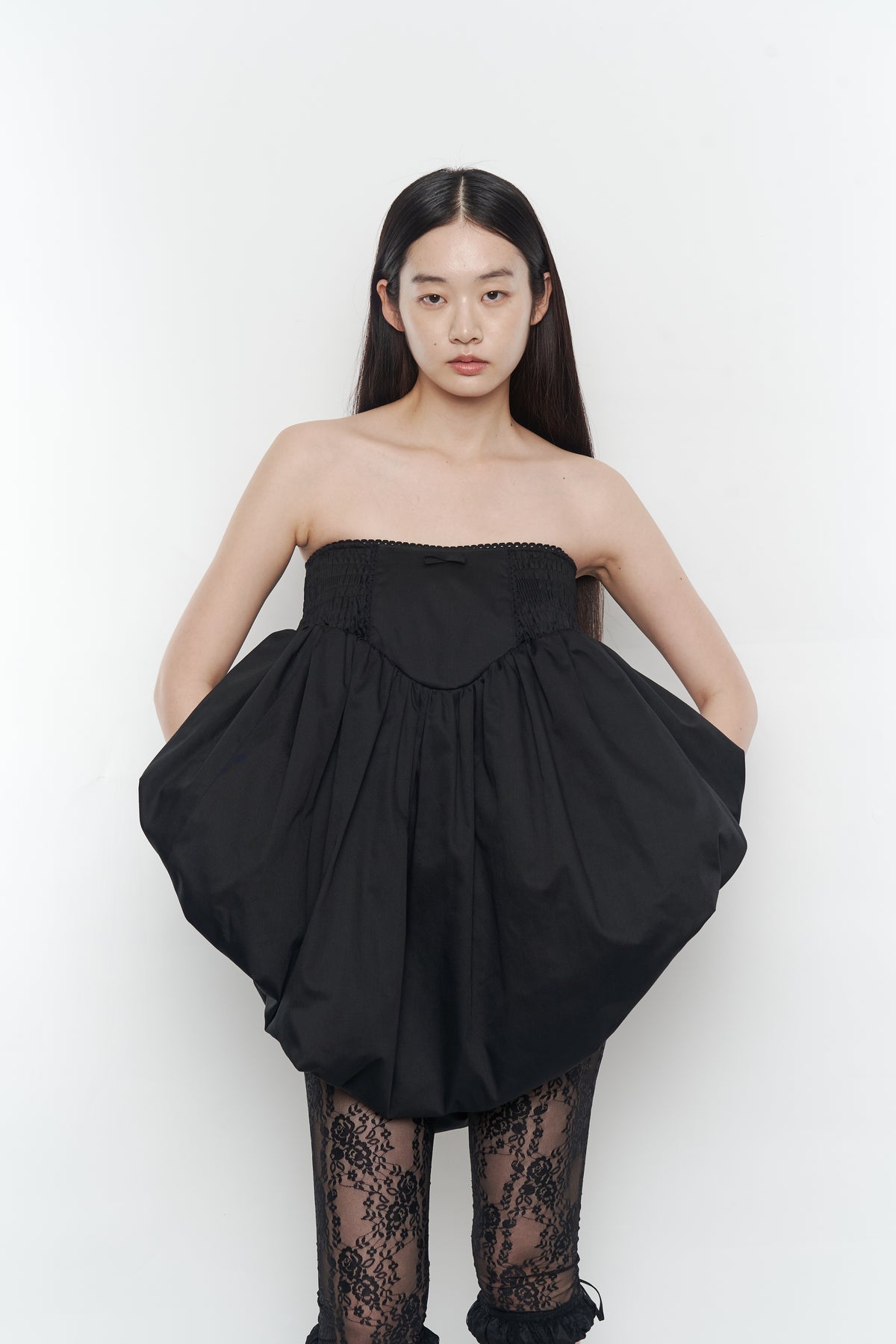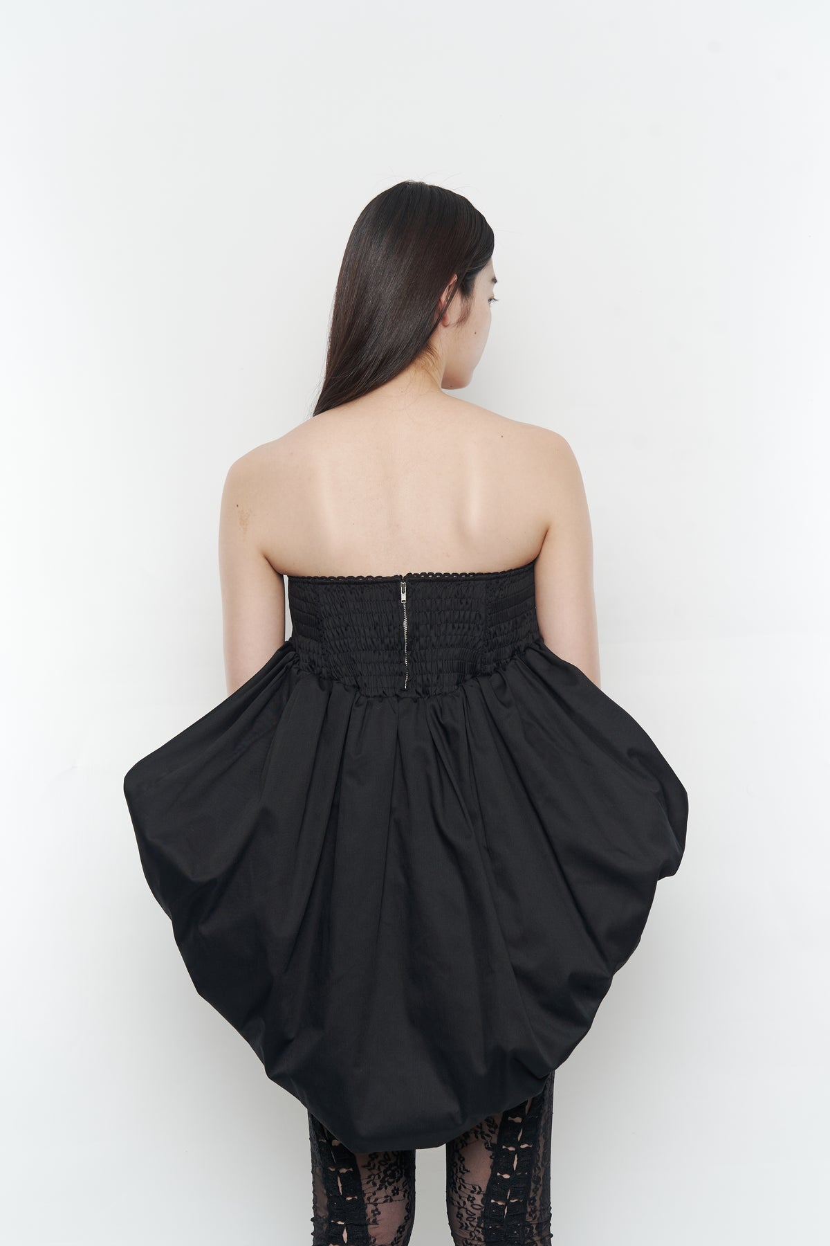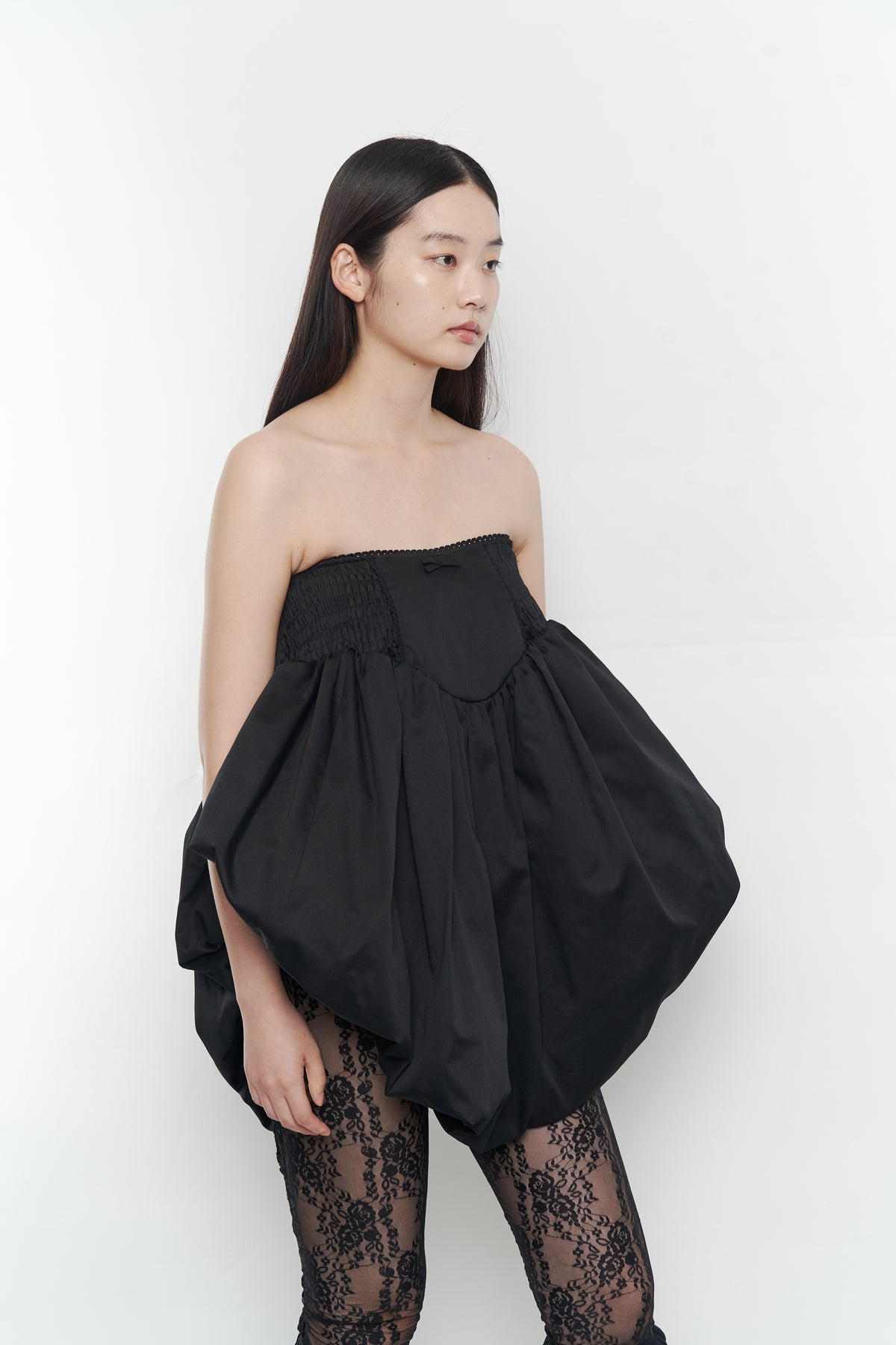 ・ゴムシャーリングとギャザーから成るボリュームで、ノーブルな印象に。