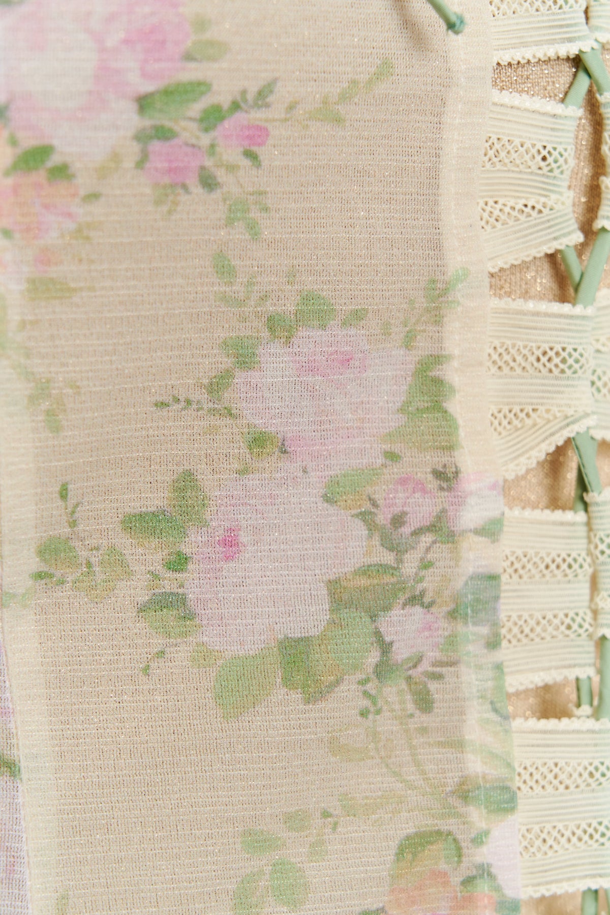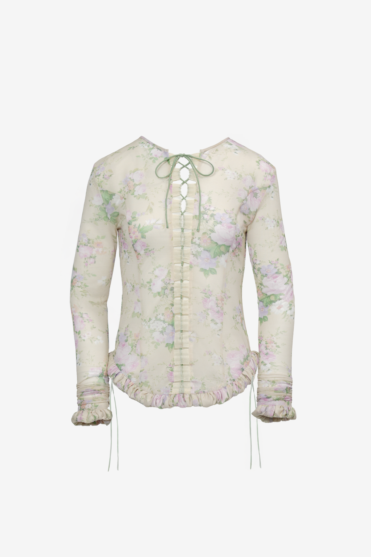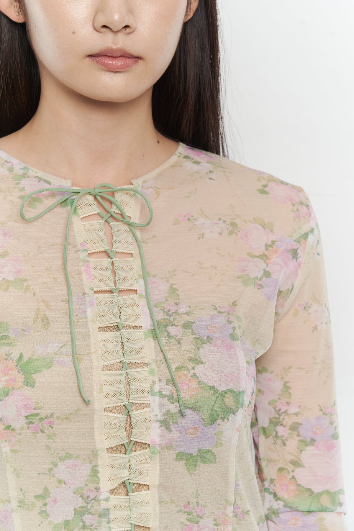 - The center of the body and both sides are laced up with green strings that resemble flower trunks and vines.