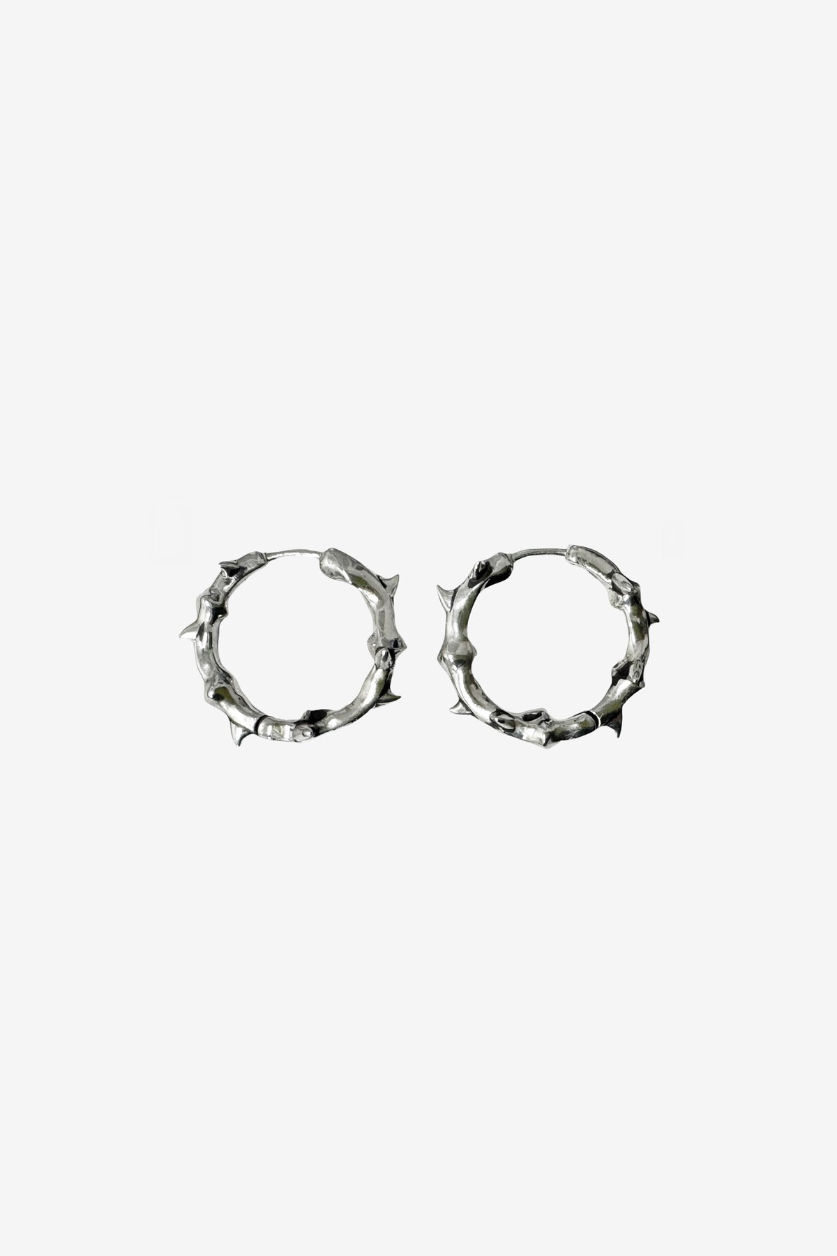棘の付いたバラのつるをモチーフにしたフープピアス。有機的なラインを無機質な素材で表現した、ストイックなアイテムです。