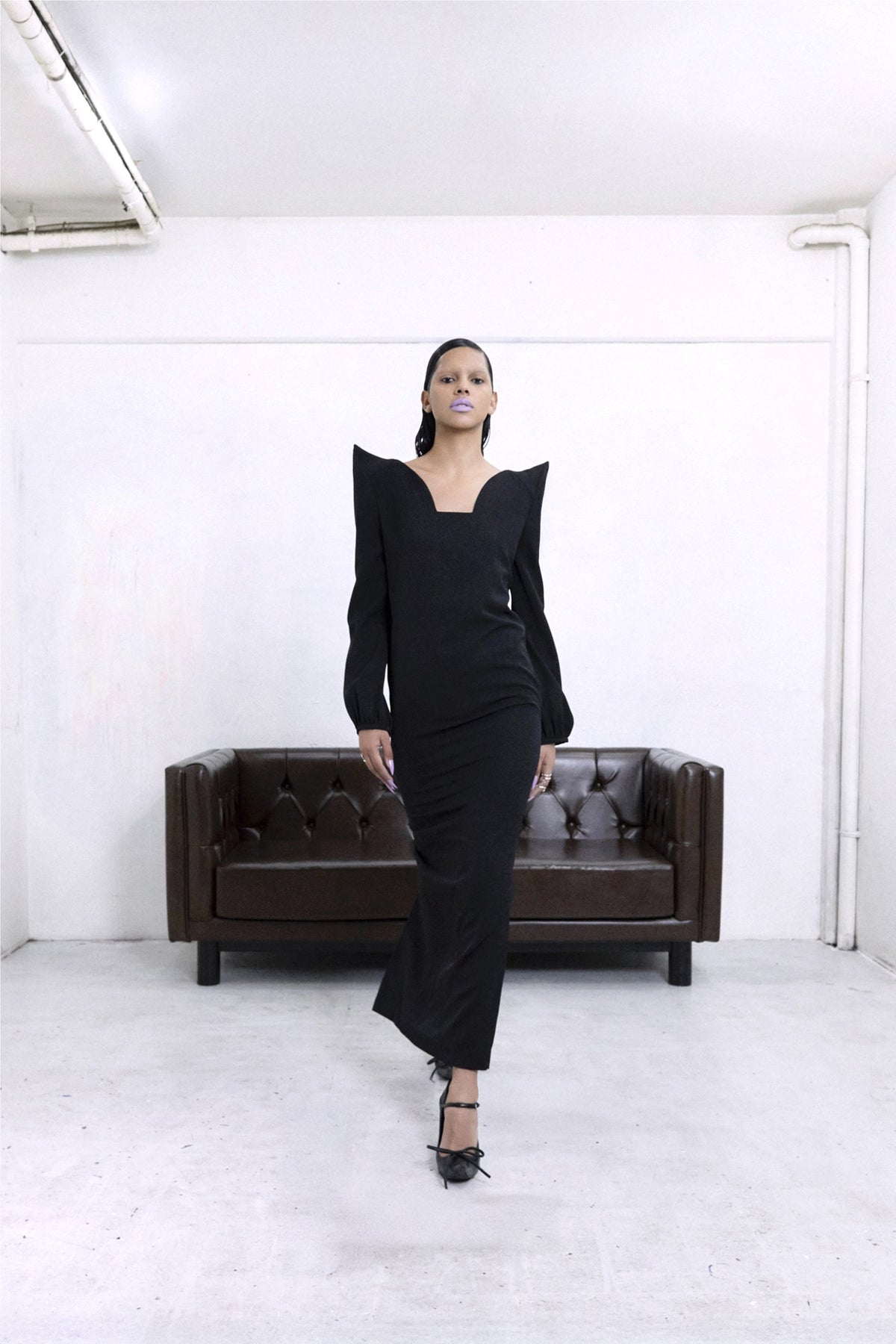 ・奇妙なカッティングの首元から、ツノのように尖った肩のフォルムにかけて、一見繋がって見える絵に描いたようなラインがポイント。